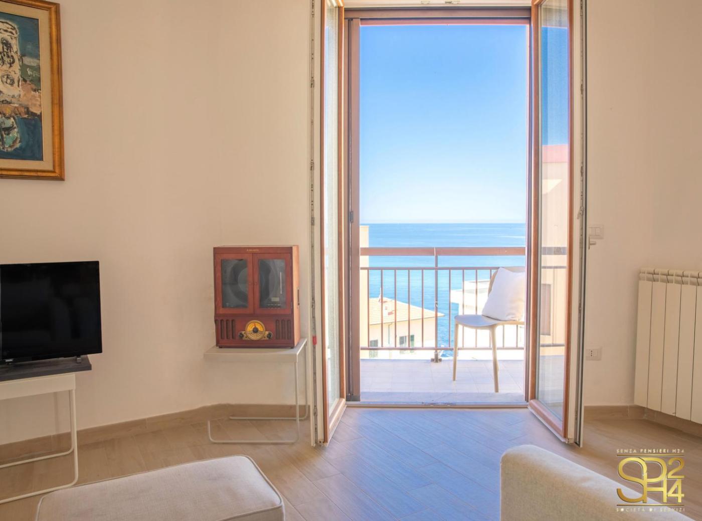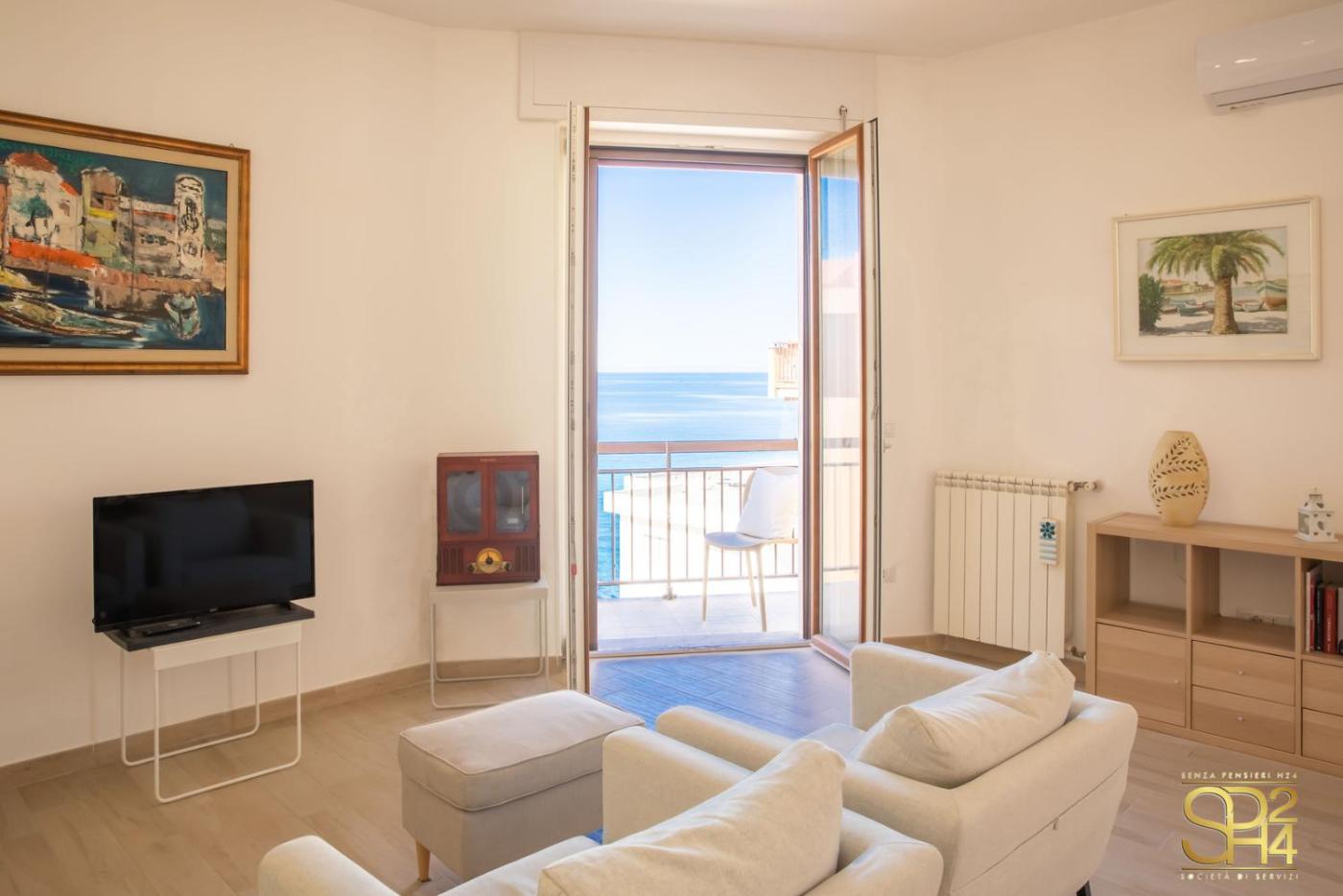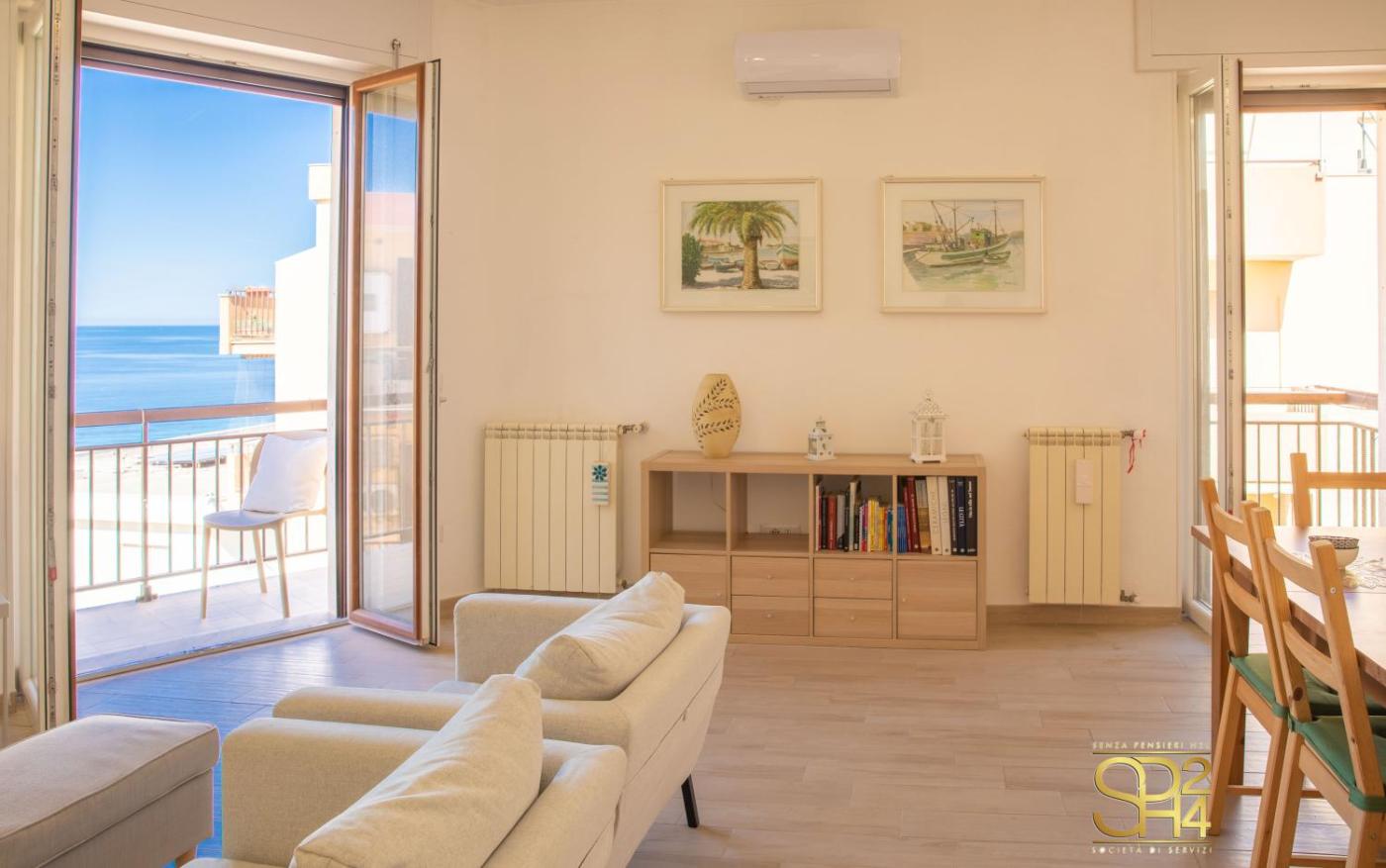 Appartamento con Vista Mare. This spacious apartment features 1 living room, 2 separate bedrooms and 2 bathrooms with a shower and a bidet. The well-fitted kitchen has a stovetop, a refrigerator, a dishwasher and kitchenware. The air-conditioned apartment features a flat-screen TV, a washing machine, a coffee machine, a seating area as well as sea views. The unit has 5 beds.